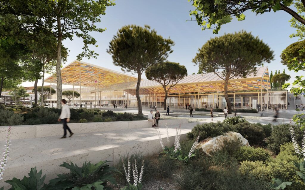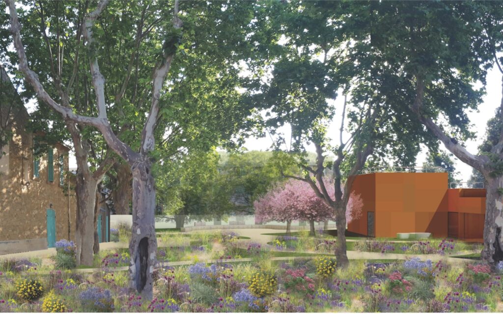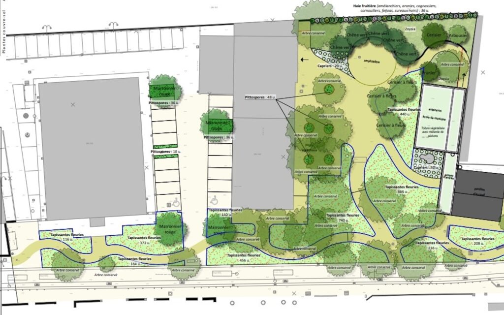 Les cheminements piétons traversent ses espaces ombragés par de grands platanes existants conservés.