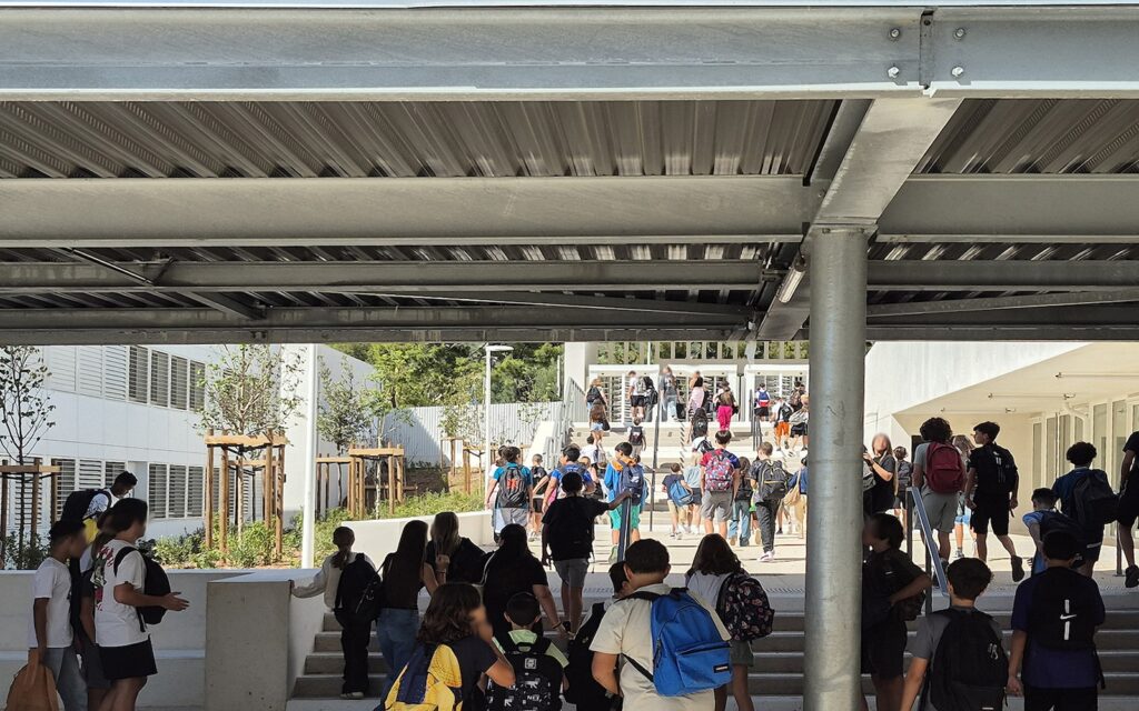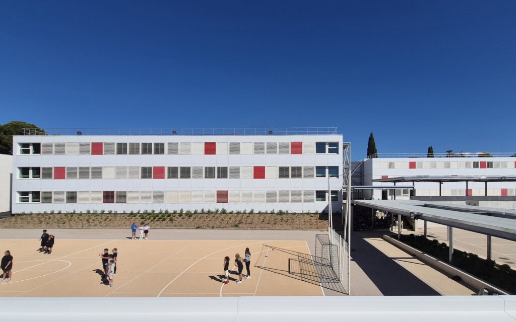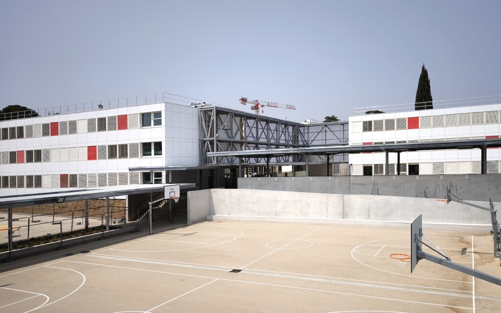 Le projet de réhabilitation paysagère préserve l’ambiance de campus du collège, qui s’inscrit dans un ancien parc. Des prairies conservées accueillent une collection d’arbres nobles adaptés, comme des magnolias ou des ginkgos. La composition principale est une grande coulée verte mêlant des arbres et arbustes indigènes (chênes, érables, lauriers-tins), à la manière des collines voisines. Pour la sécurité incendie, aucun pin n’est ajouté aux arbres existants afin de rompre la continuité de la canopée. En référence à un ancien moulin à huile du site, une colonnade d’oliviers crée un écran visuel entre le collège et les logements. La même composition borde le plateau sportif pour ombrager la façade sud du bâtiment. Enfin, une bordure fleurie accompagne le passage couvert au bout de ce plateau.