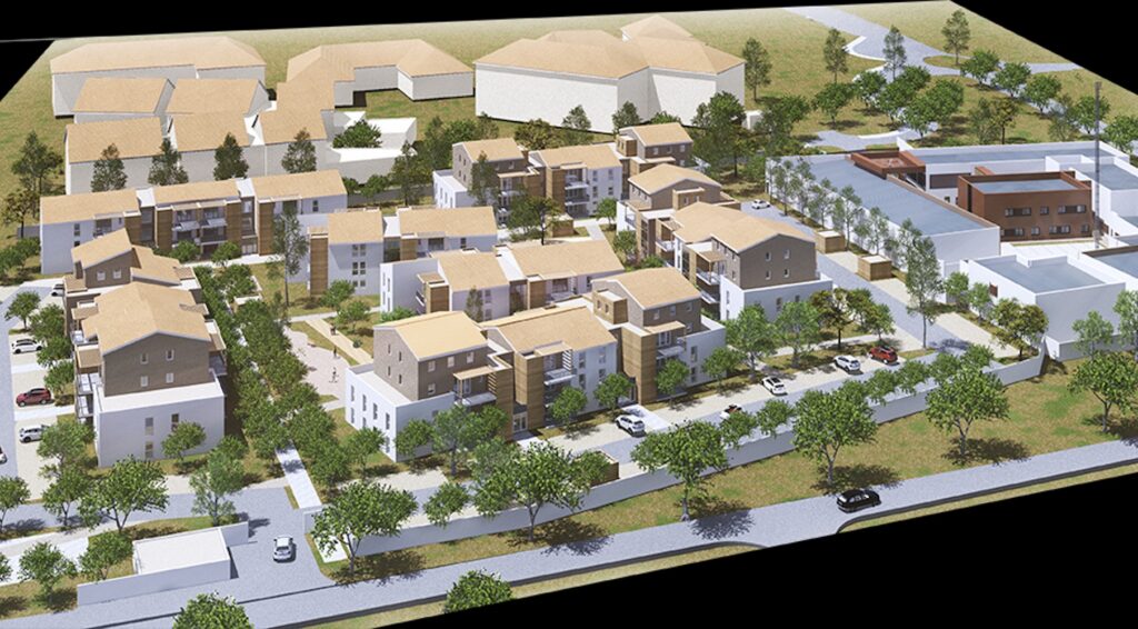 Entre les bâtiments, les surfaces d’espaces verts accueilleront un boisement arboré diffus, avec un mélange comprenant des arbres persistants et caducs le plus souvent disposés sur une simple prairie rustique.